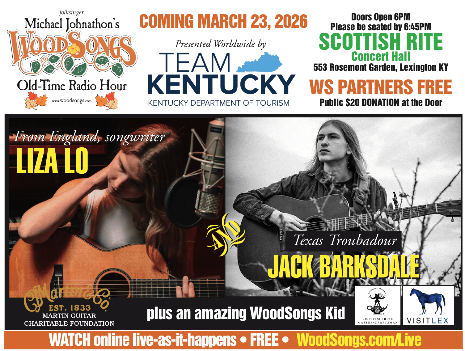 18 year old Folk Artist Jack Barksdale performs at WoodSongs Old-Time Radio Hour on Monday, March 23rd. It’s a Free Show. Also, on the bill is a songwriter all the way from England called Liza Lo. If you can’t attend the show in Lexington, KY at Scottish Rite Concert Hall, you can tune in LIVE at http://www.woodsongs.com/live